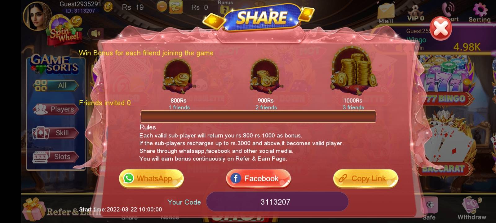 Share your referral code with friends and family. When they download and register through your link, you earn coins or bonuses. This is one of the easiest ways to earn extra without playing.